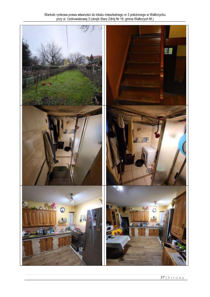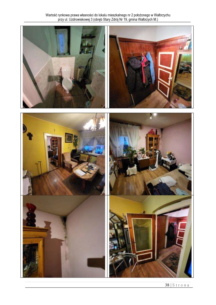 Przedmiotowy lokal nr 2 jest jednym z trzech lokali znajdujących się w budynku mieszkalnym kilkulokalowym przy ul. Uzdrowiskowej 3 w Wałbrzychu. Położony jest on na parterze – 1 kondygnacji budynku. Zgodnie z zapisami w księdze wieczystej lokal składa się z 2 pokoi i kuchni. W wyniku modernizacji w dobudówce wydzielono łazienkę ( powierzchnia dobudówki nie jest wliczona w powierzchnie użytkową lokalu).. Ponadto w lokalu znajduje się jeszcze przedpokój i wc. Lokal nie w pełni rozkładowy, z pomieszczeniem przechodnim z dobrym doświetleniem światłem dziennym. Z jednego pokoju przechodzi się do drugiego pokoju. Do lokalu przynależy ponadto piwnica o powierzchni 6,50 m2 (nie ujęta w księdze wieczystej). W lokalu centralne ogrzewanie. Piec na węgiel zamontowany w piwnicy. Lokal nie jest podłączony do miejskiej sieci gazowej, mimo iż w budynku jest gaz. Powierzchnia użytkowa lokalu ( zgodnie z księgą wieczystą): 44,00 m2 Powierzchnia użytkowa lokalu na podstawie pomiarów z wizji lokalnej: 48,21 m2 Różnica powierzchni użytkowej ujawnionej w księdze wieczystej i powierzchni użytkowej pomierzonej z natury o wartości 4,21 m2, wynika z adaptowania pomieszczenia gospodarczego zlokalizowanego w dobudówce do budynku mieszkalnego na cele mieszkalne – łazienkę. Nie zostało to formalnie zalegalizowane i ta powierzchnia łazienki nie została ujęta w powierzchni użytkowej lokalu. Standard wykończenia lokalu – niski.