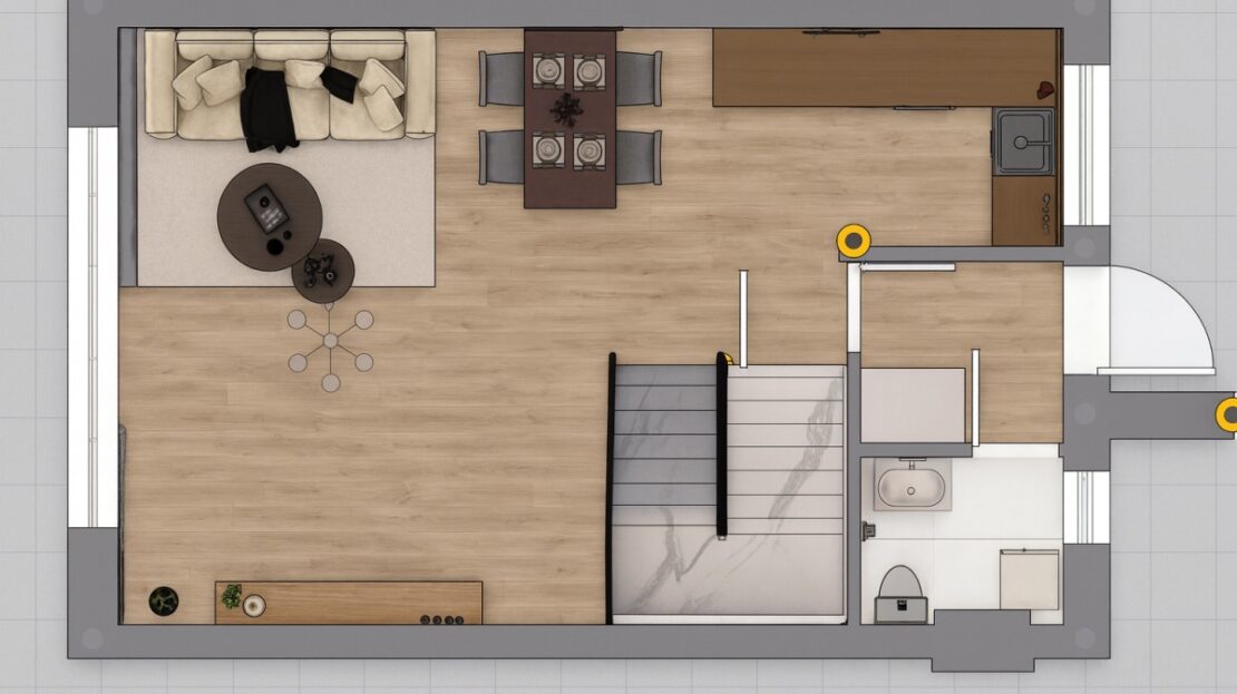 salon z aneksem kuchennym, łazienka, wiatrołap, schowek