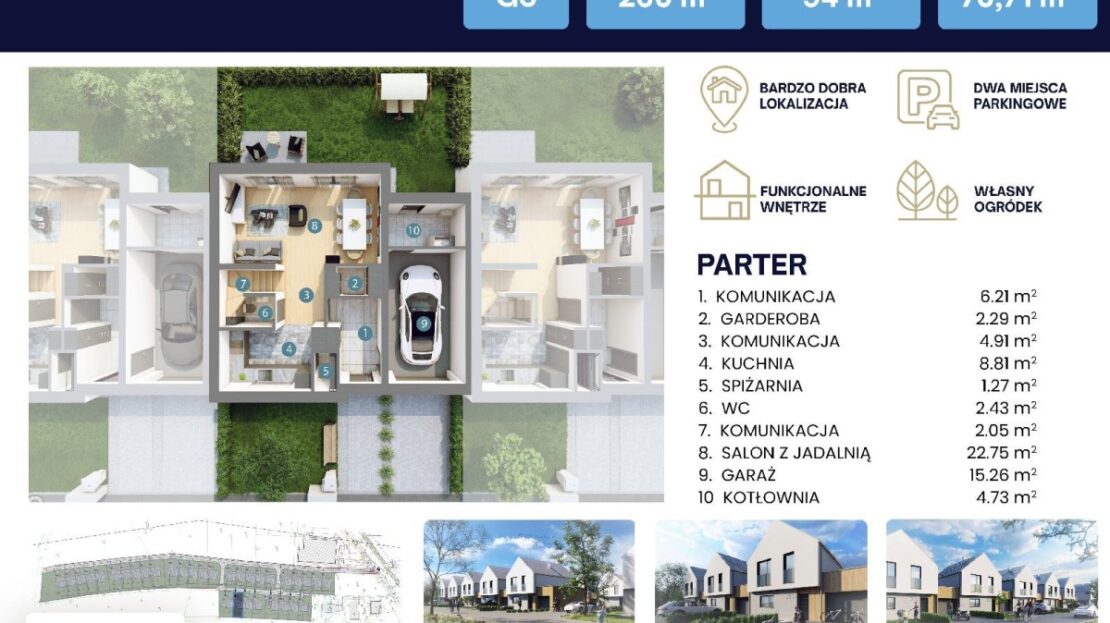 Na parterze znajduje się przytulny wiatrołap z garderobą, funkcjonalna kuchnia, elegancki salon z jadalnią i bezpośrednim dostępem do ogrodu, oraz toaleta. Schody zabiegowe prowadzą na piętro, gdzie są dwie sypialnie, łazienka oraz przestronna sypialnia z garderobą i prywatną łazienką.
