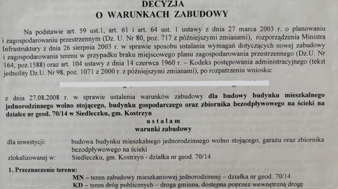 Działka ma bardzo korzystny, prostokątny kształt, co daje duże możliwości zagospodarowania przestrzeni i budowy wygodnego domu z ogrodem. Dla nieruchomości wydane zostały warunki zabudowy na dom jednorodzinny wraz z garażem. Bezpośrednio w drodze przy działce dostępne są media: prąd, woda oraz telefon, co znacznie ułatwia rozpoczęcie inwestycji.