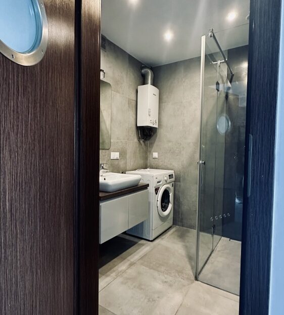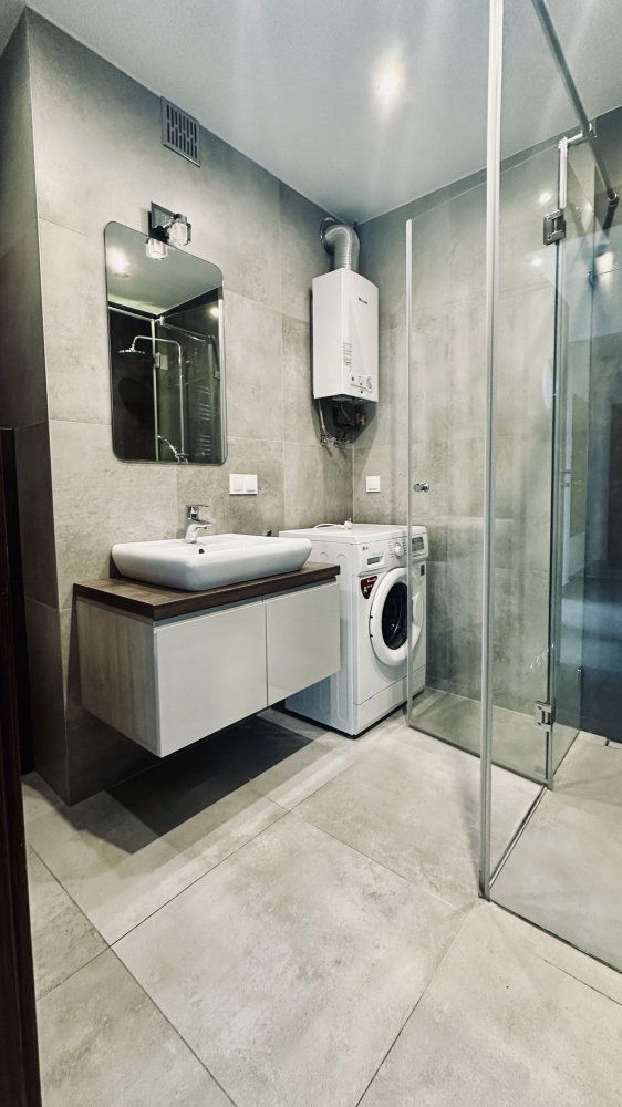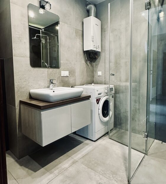 w łazience zainstalowano dużą kabinę prysznicową z odpływem liniowym, toaletę bezkołnierzową.