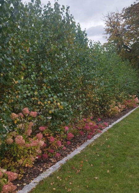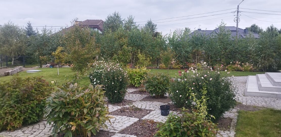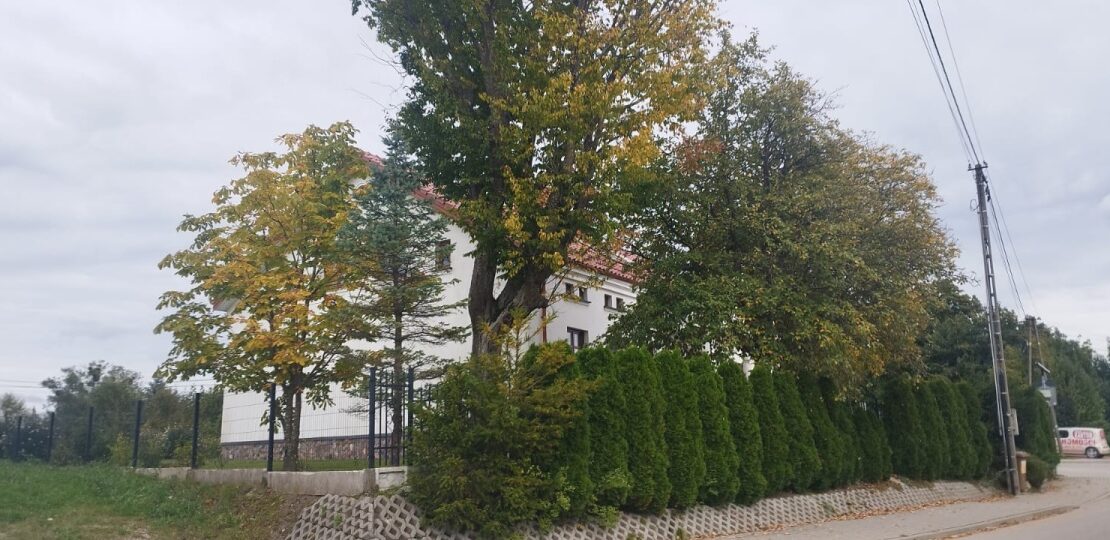 Działka ogrodzona (front: metaloplastyka, reszta: siatka), liczne nasadzenia