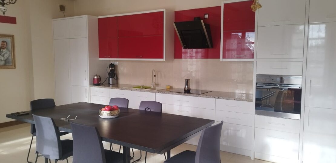 Kuchnia w zabudowie (sprzęty AGD: płyta, piekarnik, lodówka, zmywarka)