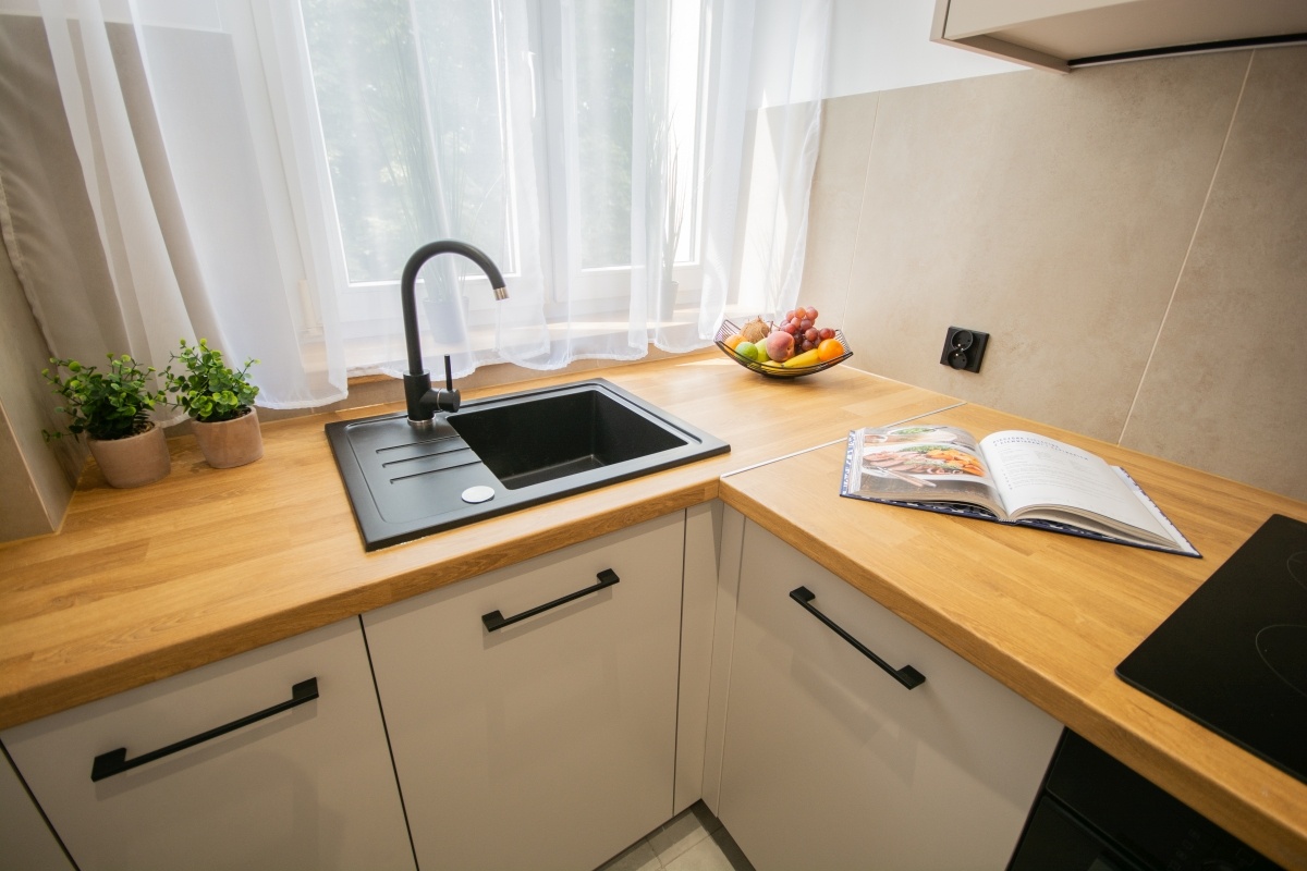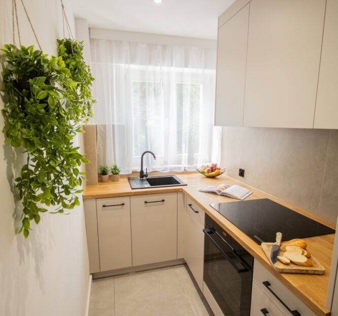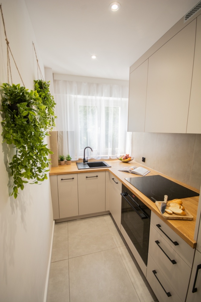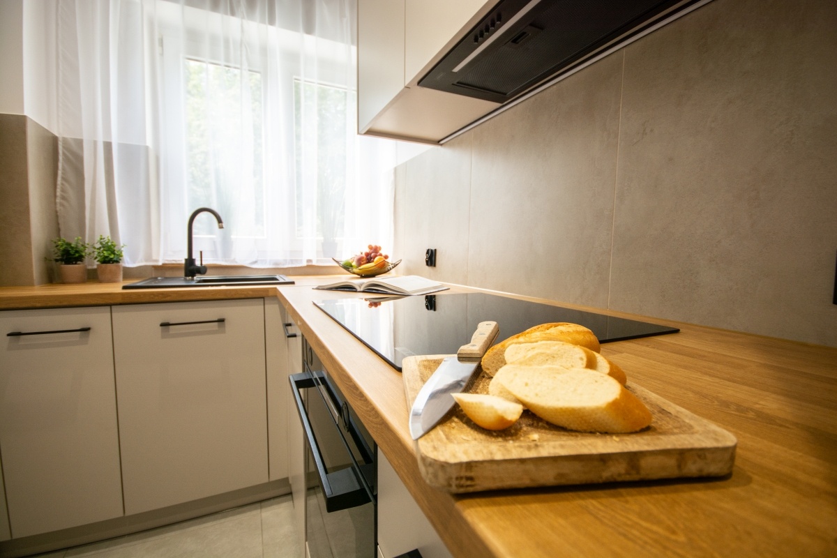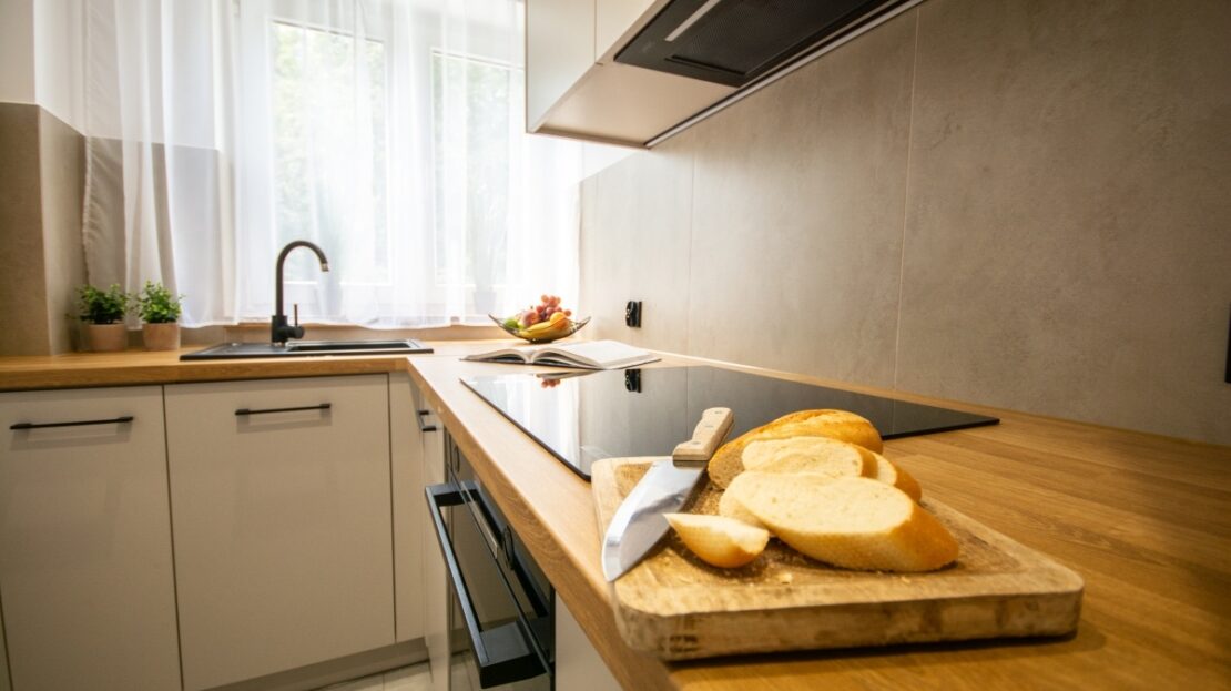 – sprzęt AGD – wysokiej klasy piekarnik Bosch, płyta indukcyjna Bosch, okap, oświetlenie LED