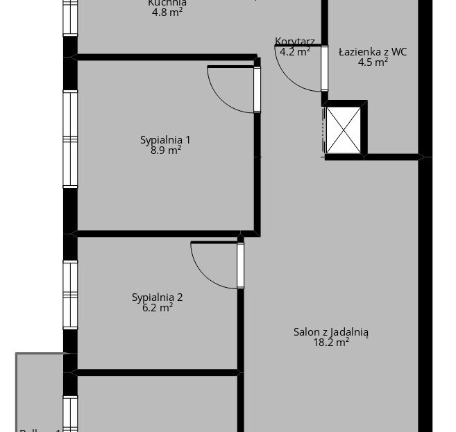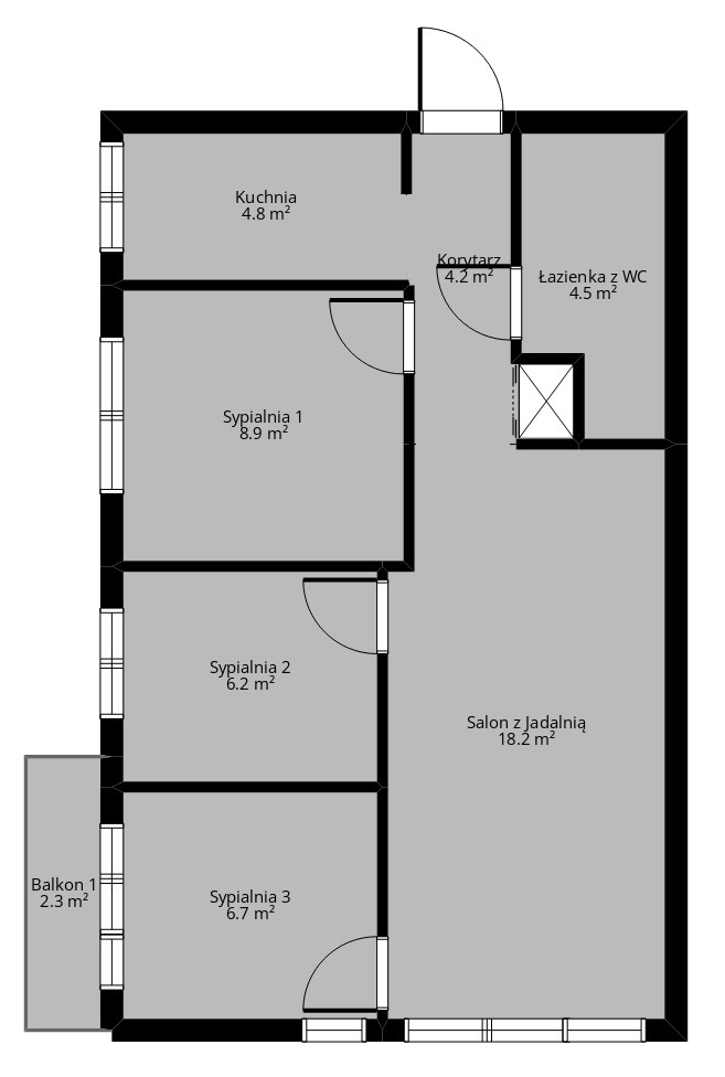 – 4 pokoje – salon z jadalnią (18 mkw), 3 sypialnie (8,9 mkw, 6,7 mkw i 6,2 mkw), kuchnia (4,8 mkw), korytarz (4 mkw), łazienka wraz z toaletą (4 mkw)