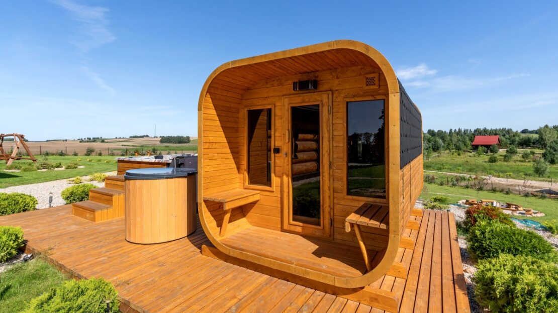 Obok domu, na drewnianym podejście, umiejscowiona jest strefa SPA wyposażona w 8-osobowe jacuzzi z hydromasażem opalane drewnem, saunę dla 8 osób również opalaną drewnem oraz drewnianą balię z zimną wodą.