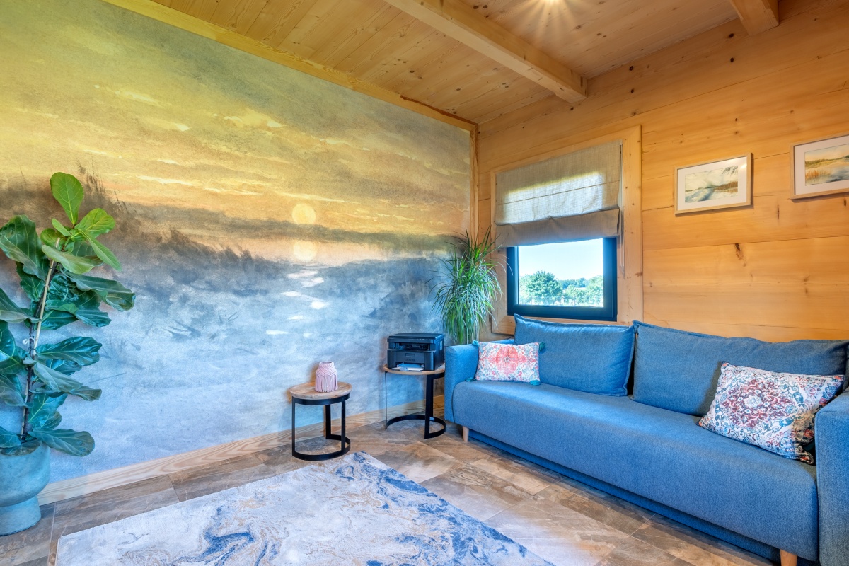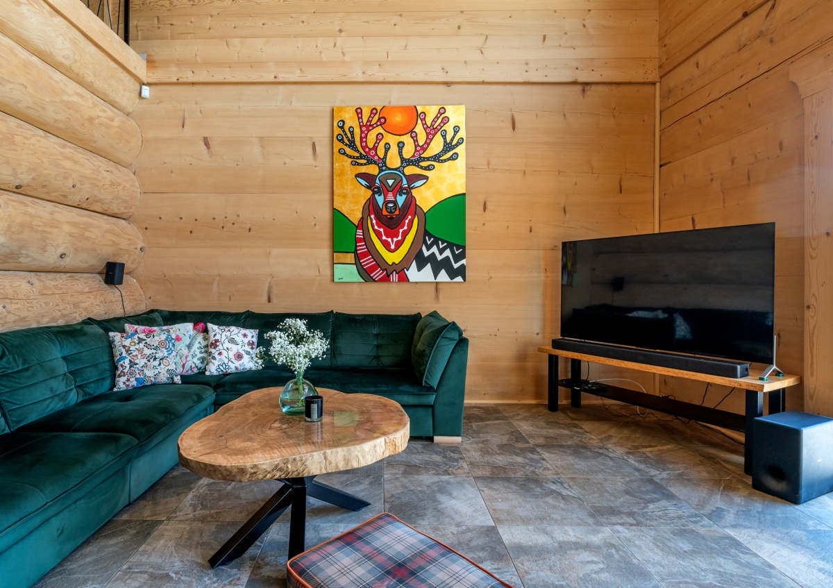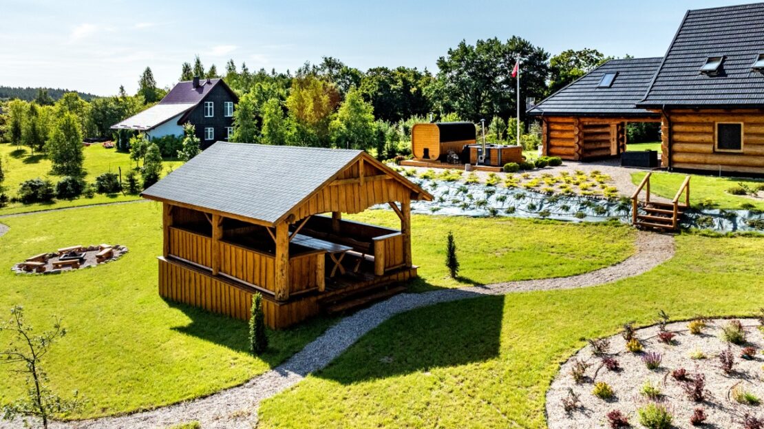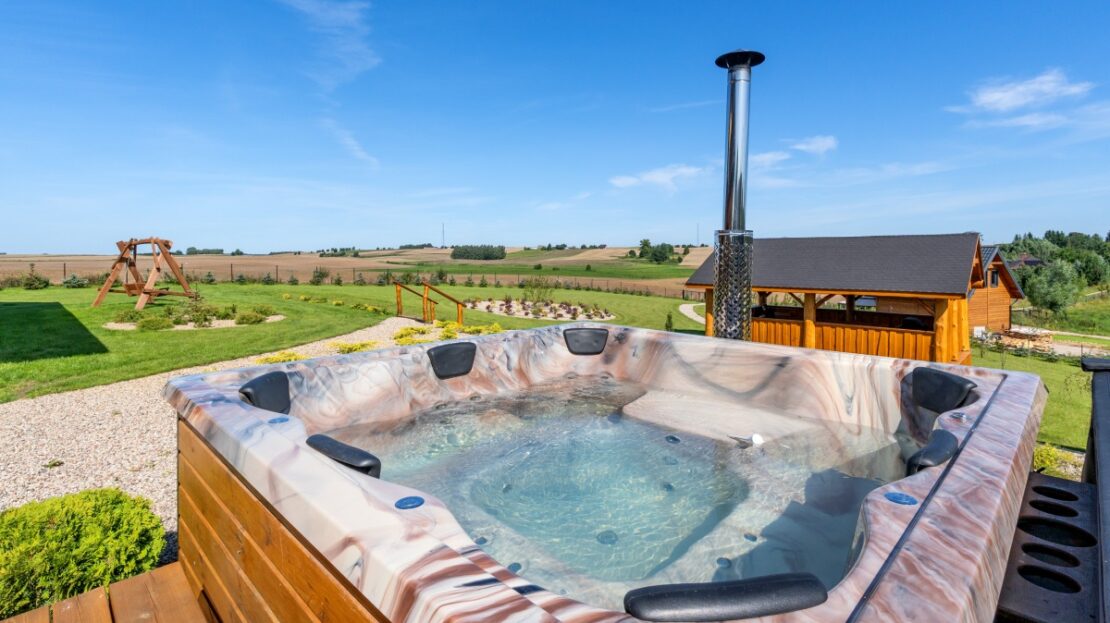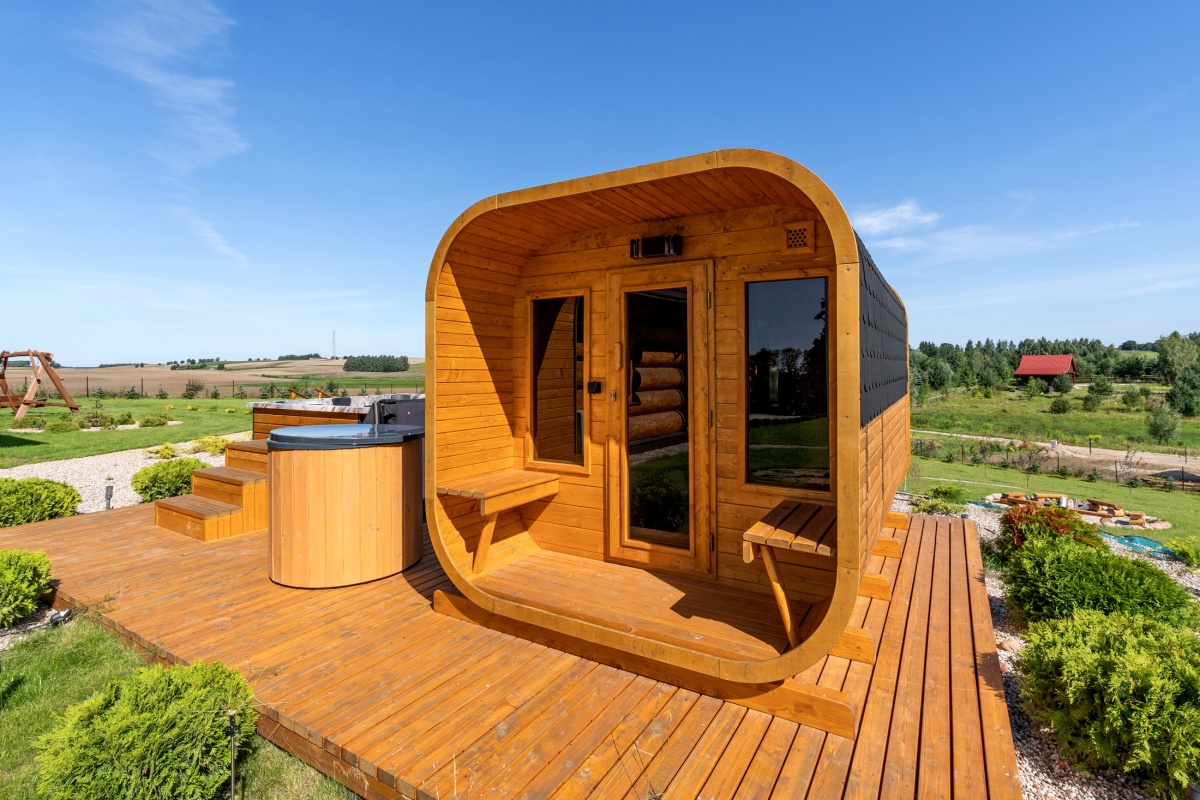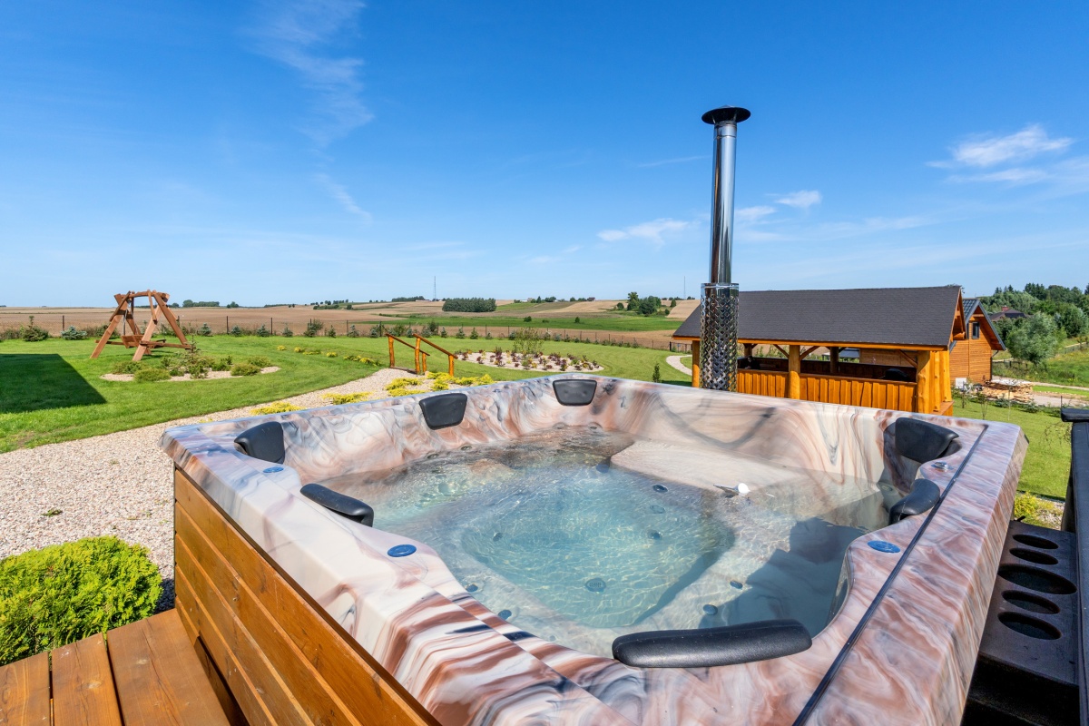 Obok domu, na drewnianym podejście, umiejscowiona jest strefa SPA wyposażona w 8-osobowe jacuzzi z hydromasażem opalane drewnem, saunę dla 8 osób również opalaną drewnem oraz drewnianą balię z zimną wodą.