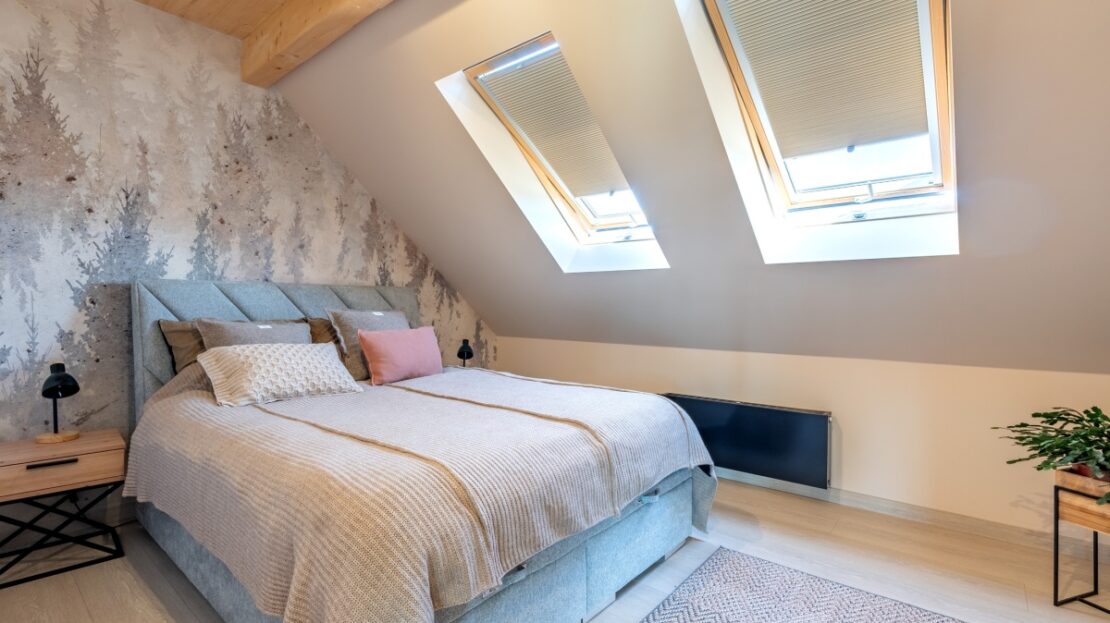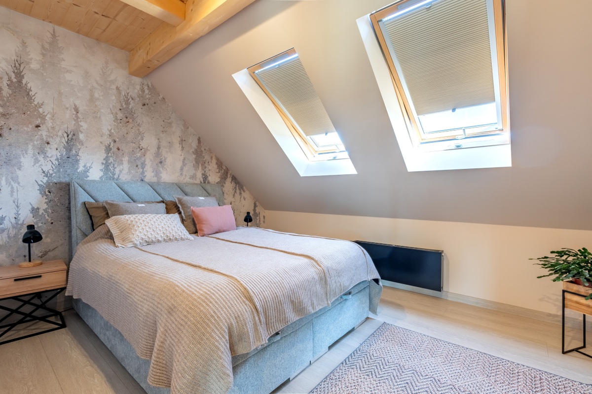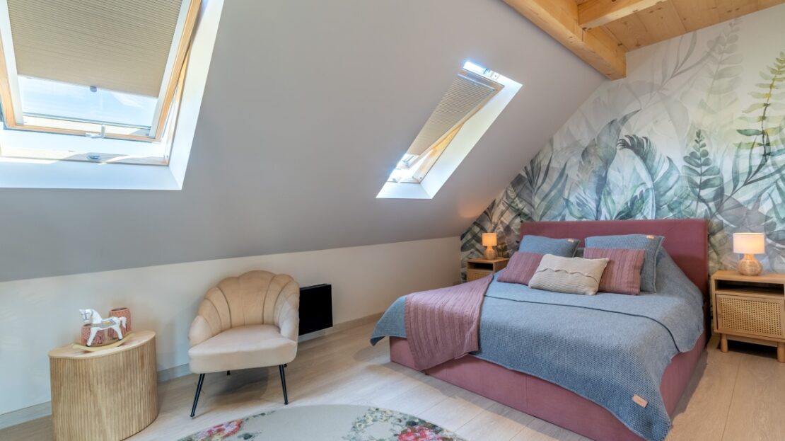 Na piętrze znajdują się trzy sypialnie, łazienka z prysznicem oraz WC.