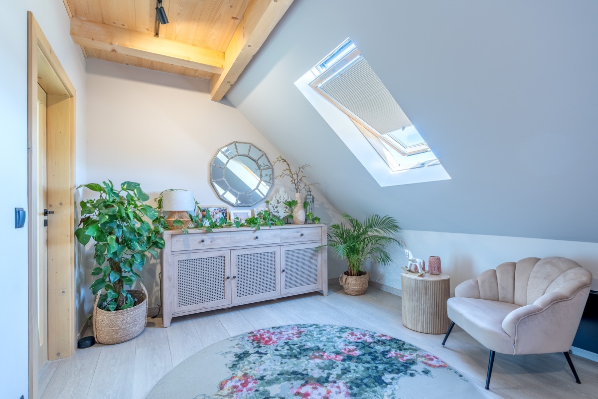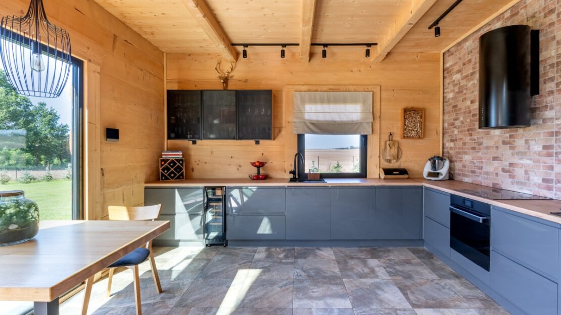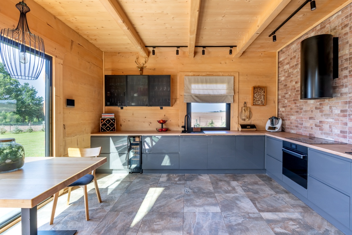 Dom jest całoroczny i ma powierzchnię 225 m2. Na parterze domu znajduje się przestronny salon z antresolą, jadalnia z otwartą kuchnią, łazienka z wanną wolnostojącą i WC, pokój gościnny, garderoba, pralnia oraz hol. Powierzchnia parteru to 130 m.