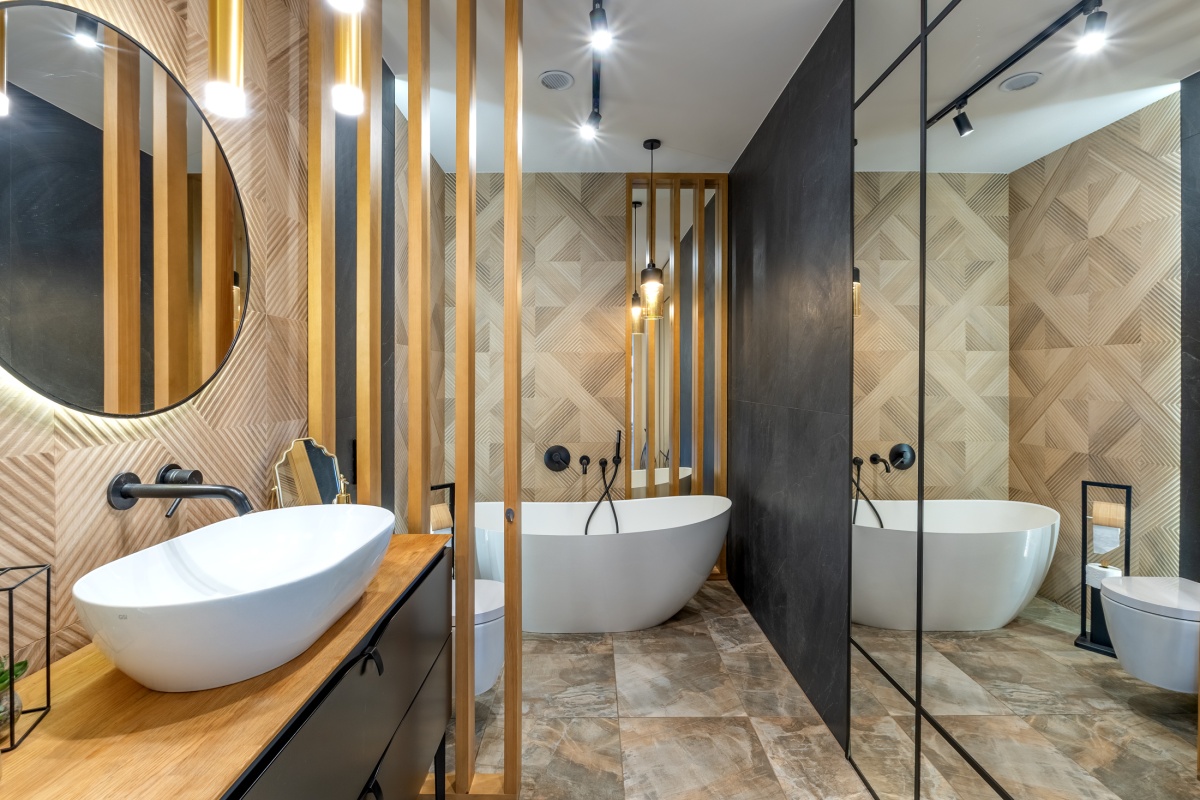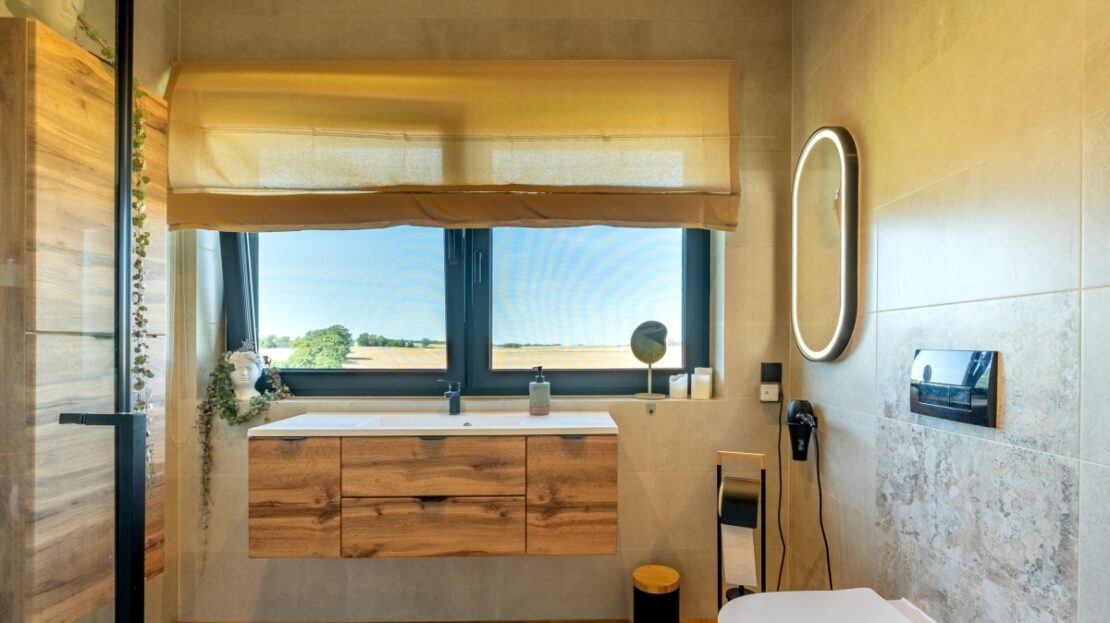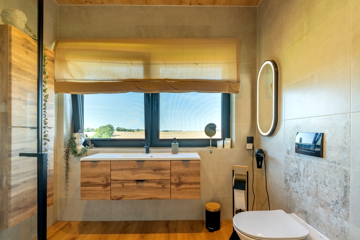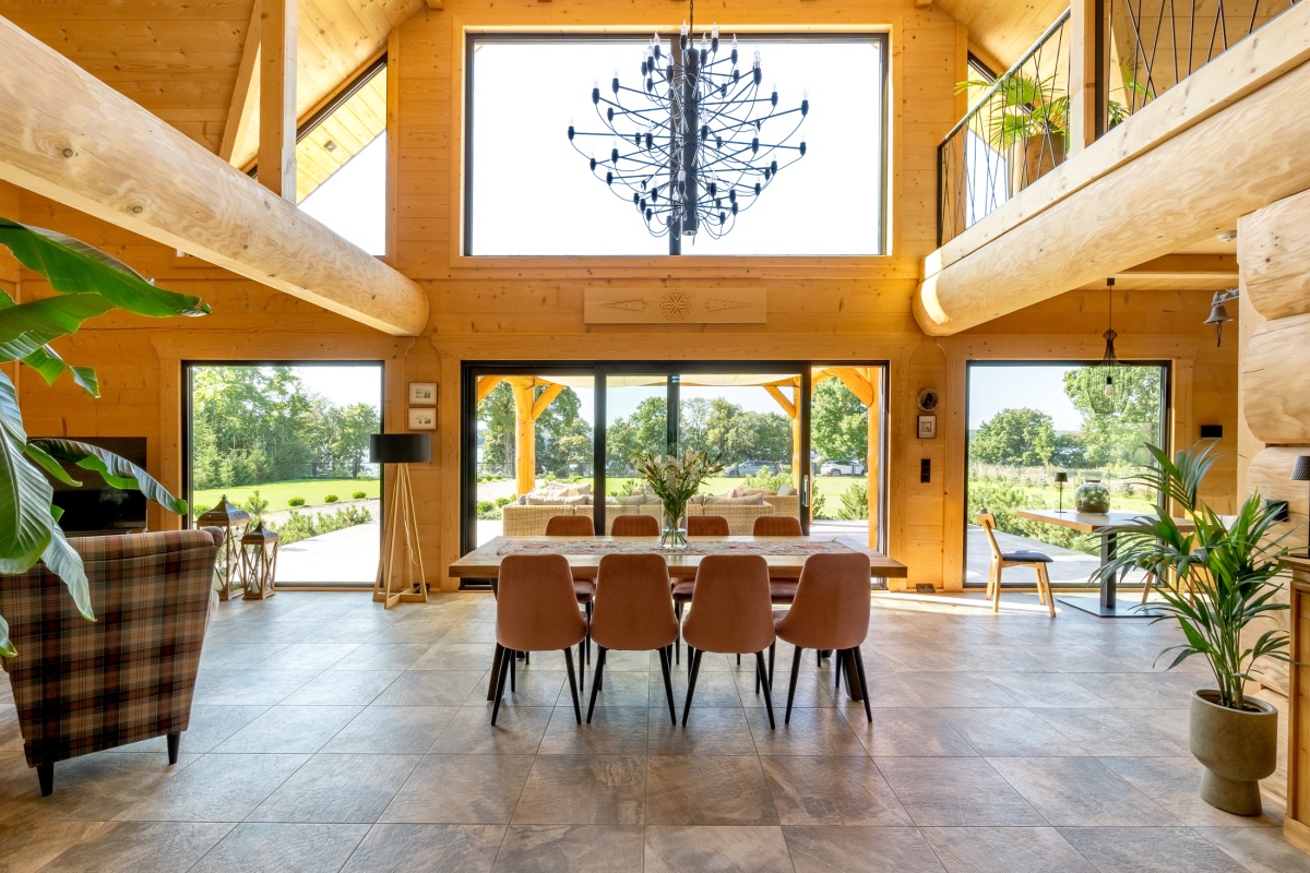 Cały front domu to wielkie przeszklenia, przez które roztacza się imponujący widok na jezioro i otaczającą zieleń. Przed domem znajduje się 50 m2 zadaszony taras z widokiem na jezioro wyposażony meble tarasowe zachęcający do niekończącego się relaksu i wypoczynku.