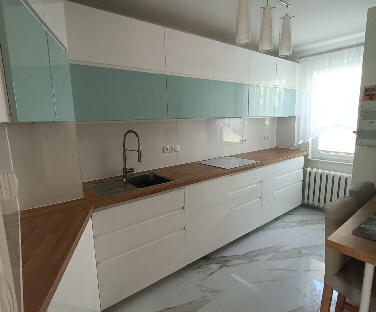 Kuchnia na wymiar z IKEA. Szafy przesuwne system IKEA. Jest pralka, zmywarka, lodówka, kuchenka indukcyjna, piekarnik.