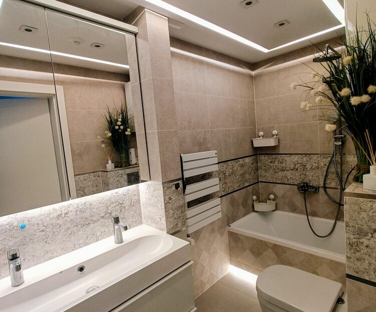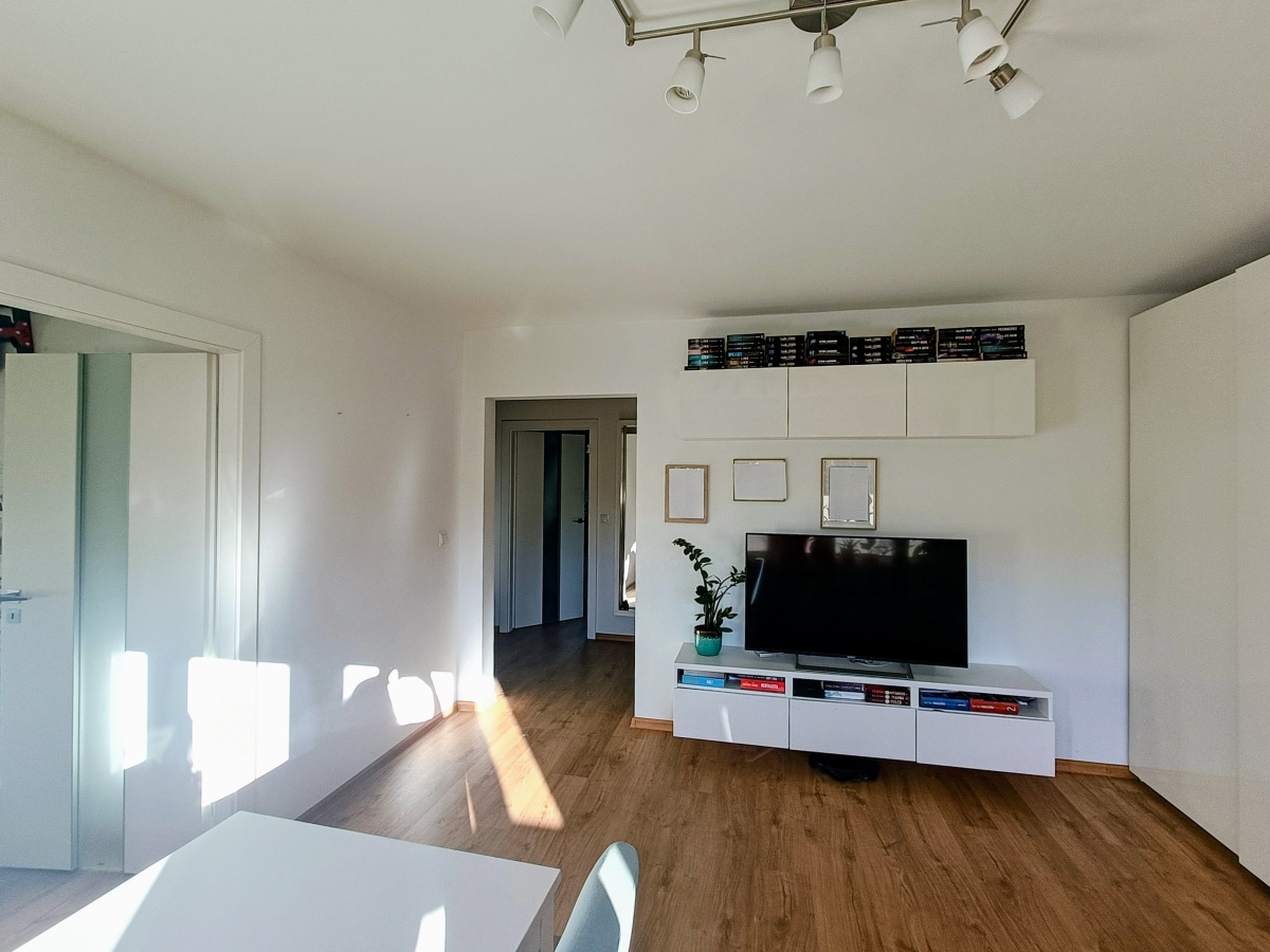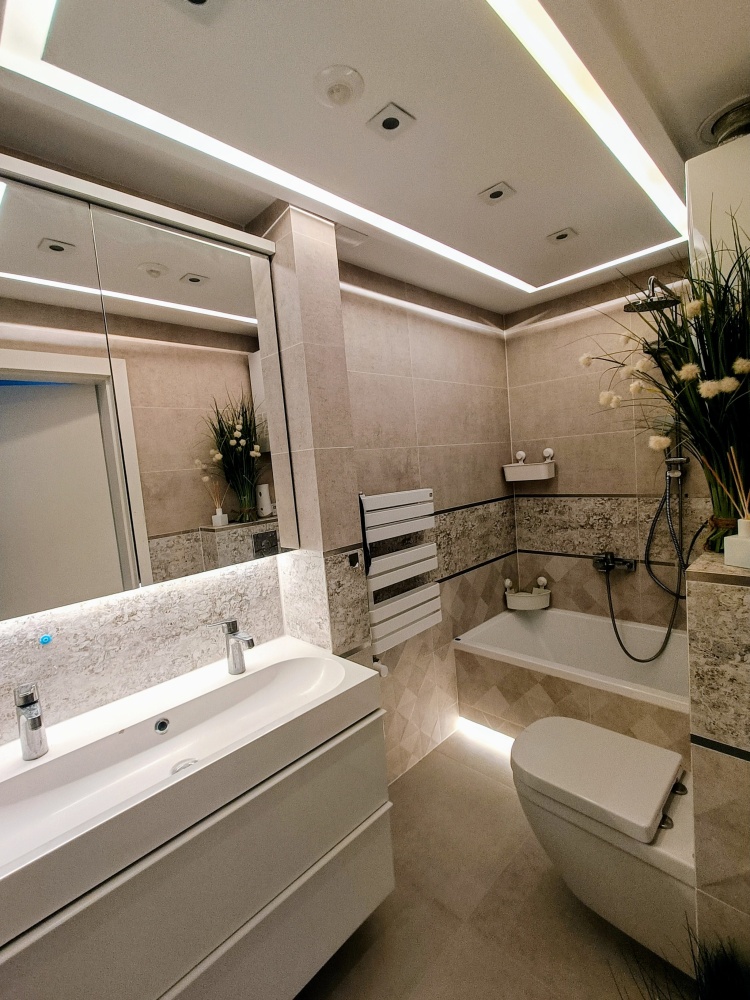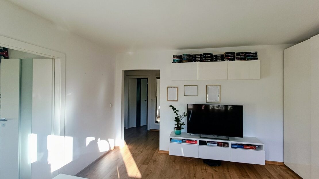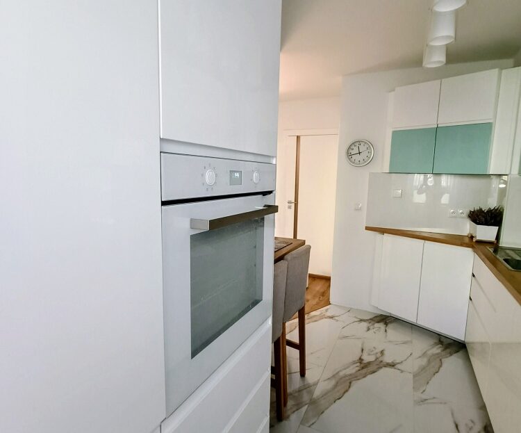 Ogrzewanie podłogowe w kuchni i łazience, automatyczne rolety zewnętrzne na pilota i przycisk. Panele winylowe QUICK-STEP.