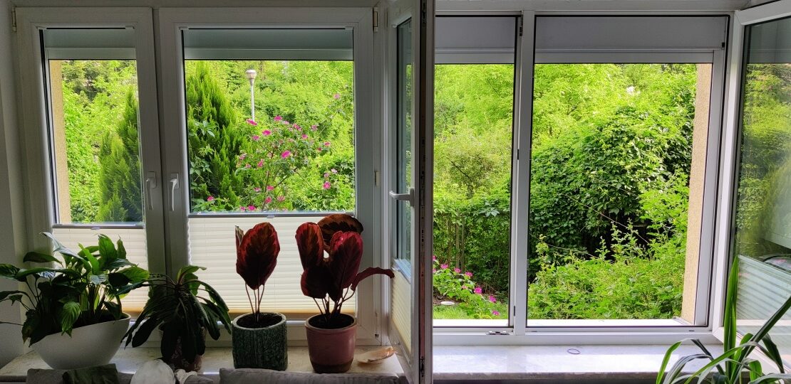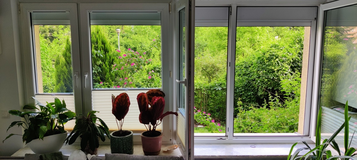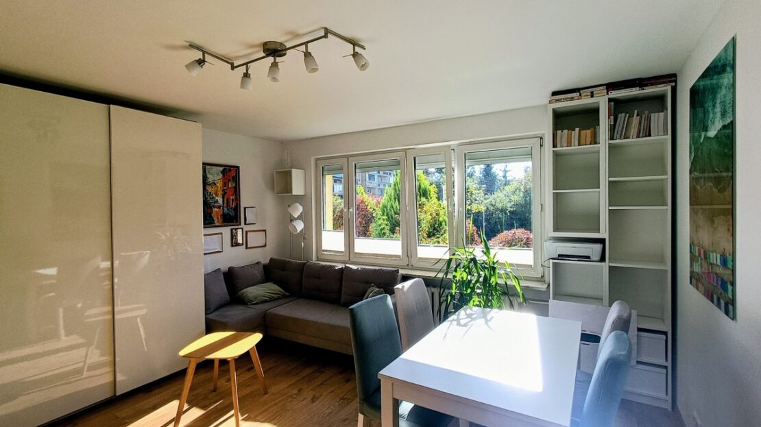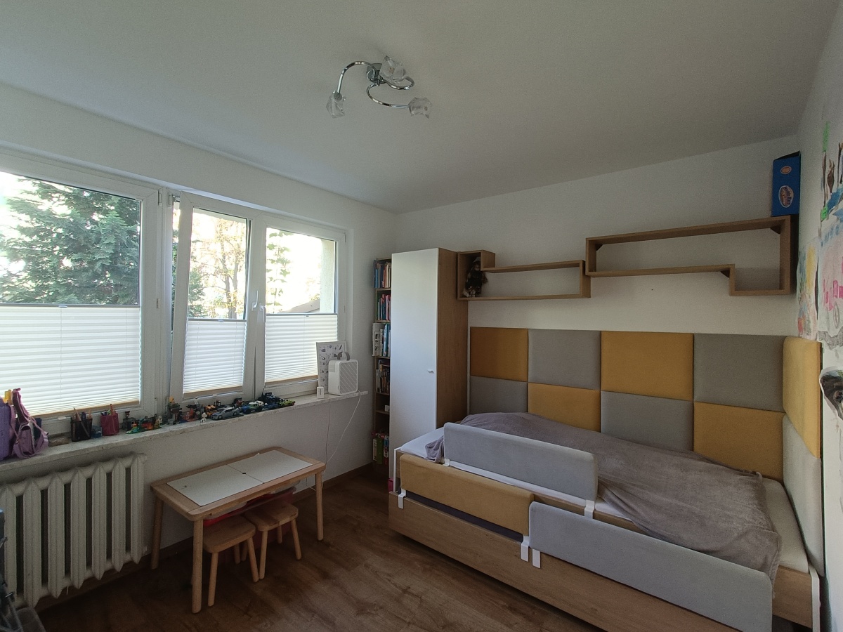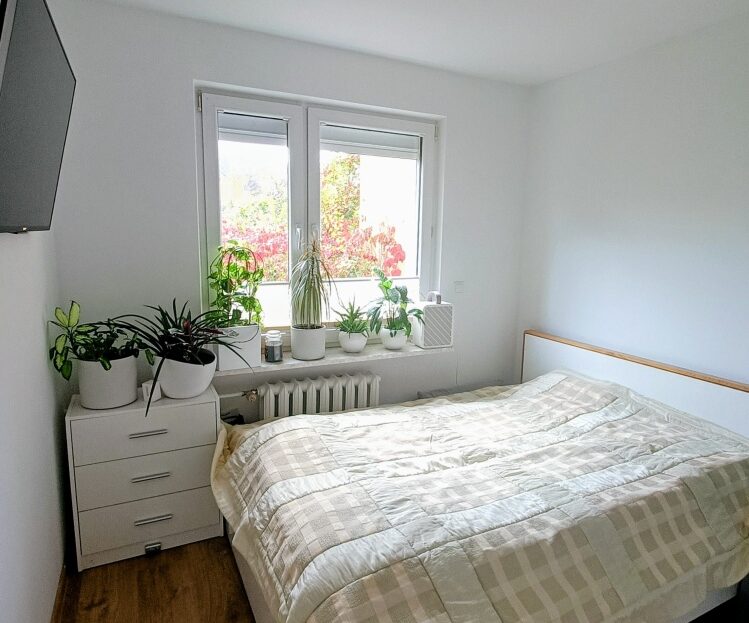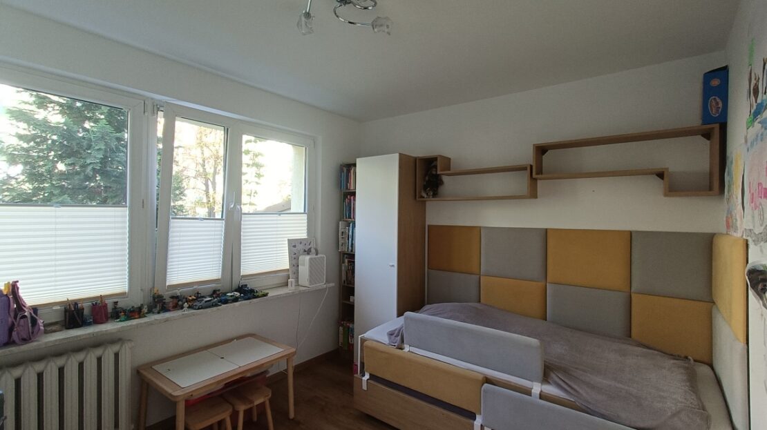 Wystawa okienna na południe i północ. Od strony południowej za oknem dużo zieleni.