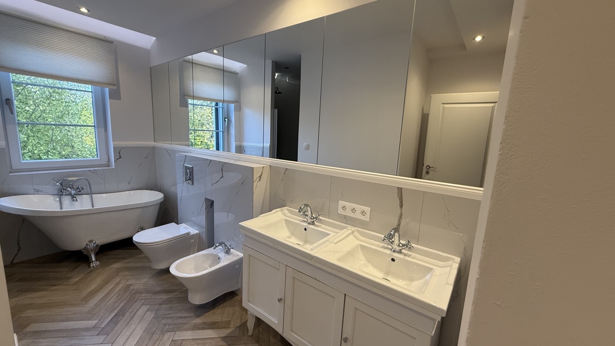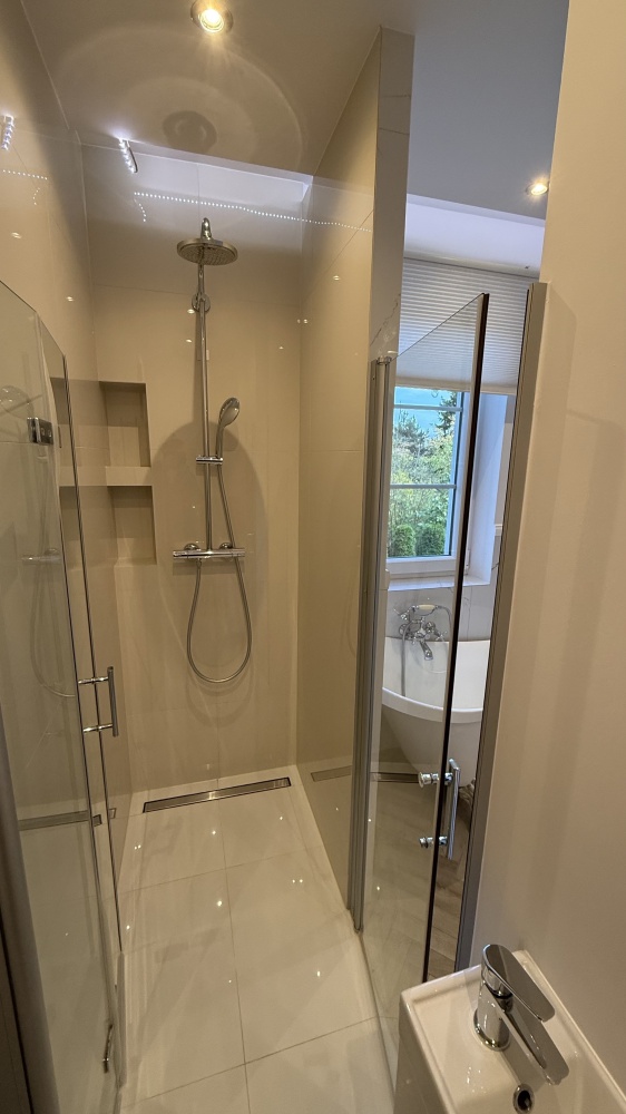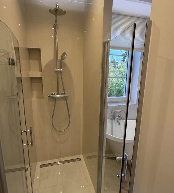 Przestronna łazienka wanną i prysznicem