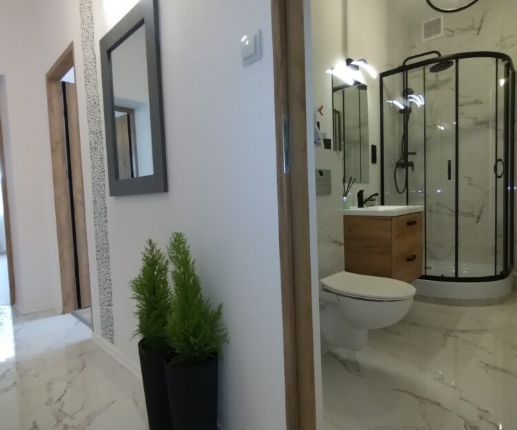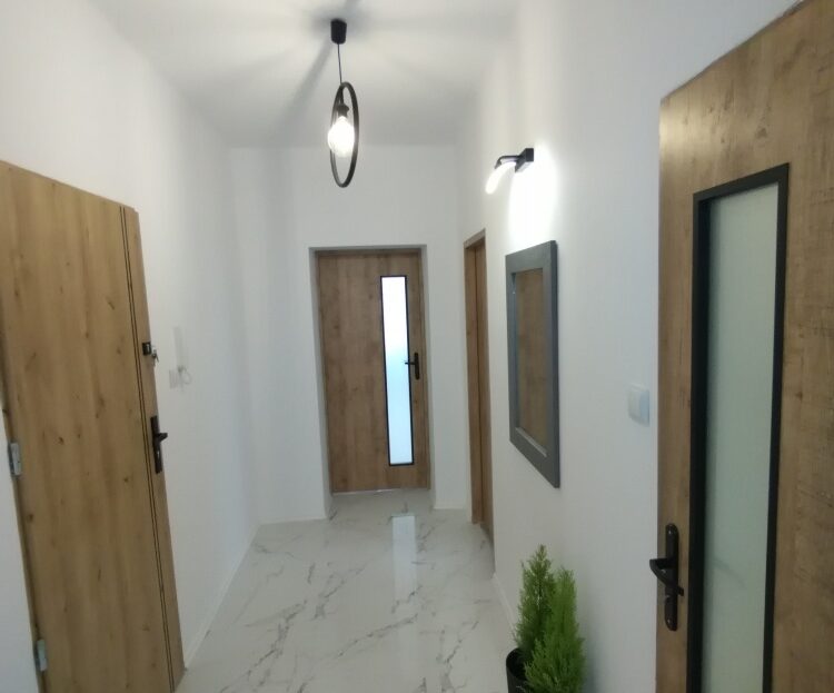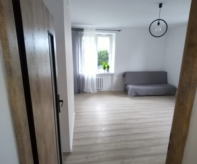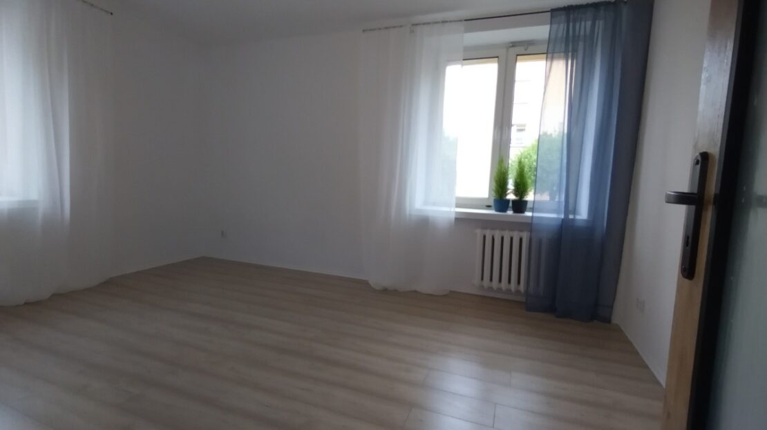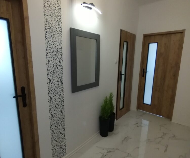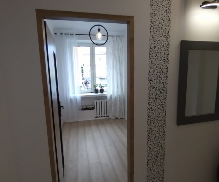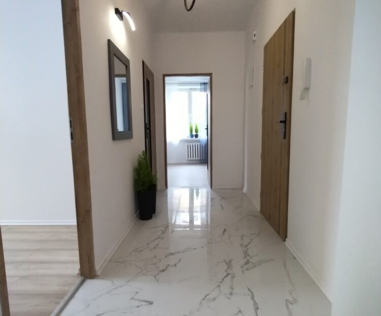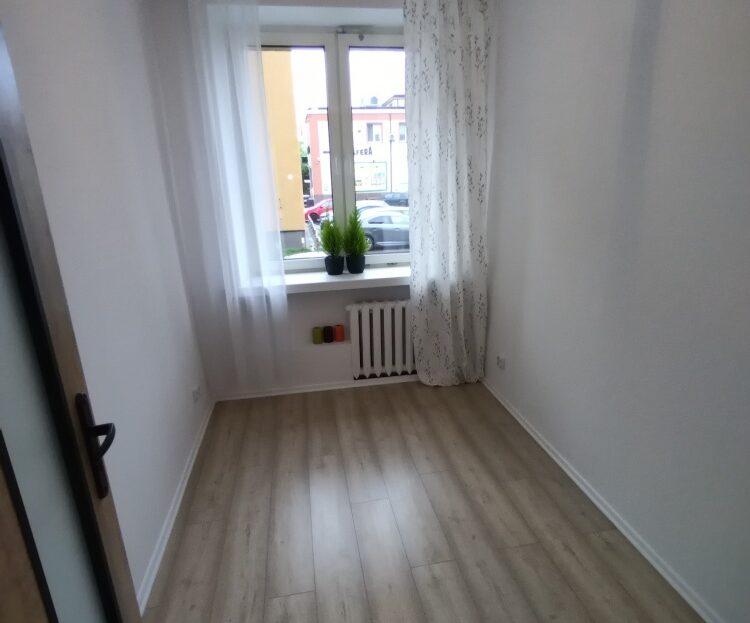 Wyremontowane, gotowe do wprowadzenia mieszkanie na parterze – 3 pokoje, kuchnia w aneksie, przedpokój, łazienka oraz piwnica. Mieszkanie dwustronne z oknami na wschód i zachód. Okna plastikowe, na podłogach panele i gres, na ścianach gładzie gipsowe. Nowe drzwi wejściowe i pokojowe. Pokoje duże w regularnych kształtach. Wymieniona instalacja wody, prądu i kanalizacji. Łazienka kompletna z kabiną prysznicową, umywalką i wc, dodatkowo przygotowana instalacja pod pralkę i suszarkę. Aneks kuchenny z przewodami elektr. pod kuchnię indukcyjną i kanałem wentylacyjnym. Centralne ogrzewanie, ciepła i zimna woda – z sieci miejskiej. Brak podzielników ciepła. Bardzo duża przynależna piwnica. Blokiem zarządza wspólnota mieszkaniowa. Blok 2-piętrowy, zbudowany z pełnej cegły, dodatkowo ocieplony, położony w osiedlowym zadrzewieniu. Bardzo małe straty cieplne. Przed blokiem duży parking. Klatki schodowe czyste, wejścia do klatek zabezpieczone domofonem. Budynek stoi z dala od ruchliwych i głośnych ulic – jest cicho i komfortowo. Blisko do stacji PKP, szkoły i przedszkola, dużo punktów handlowych i usługowych.