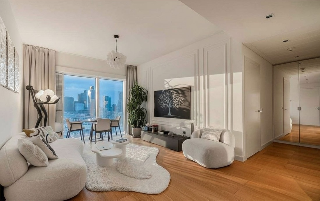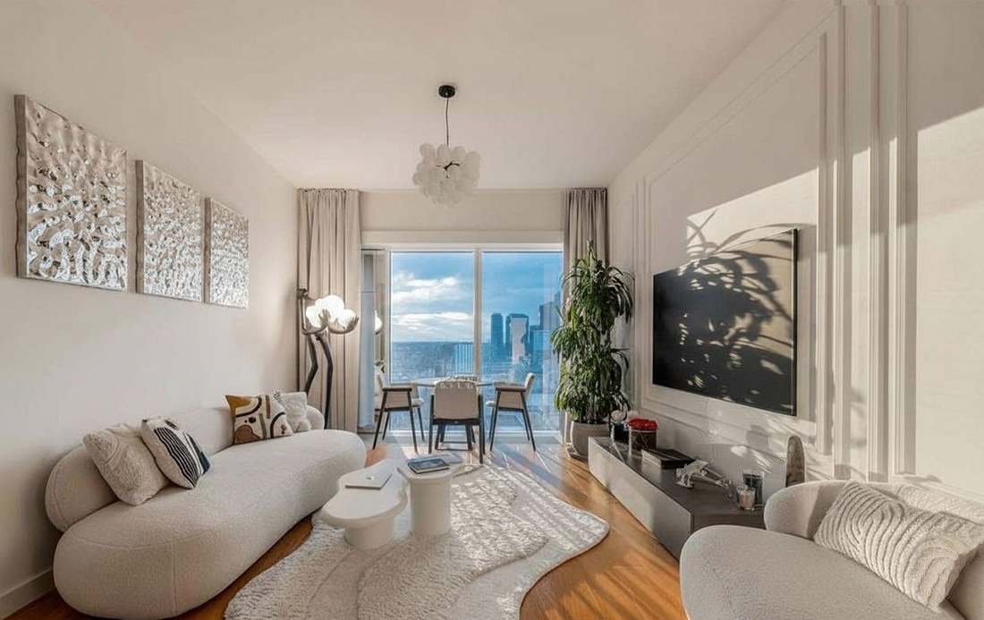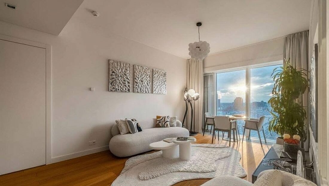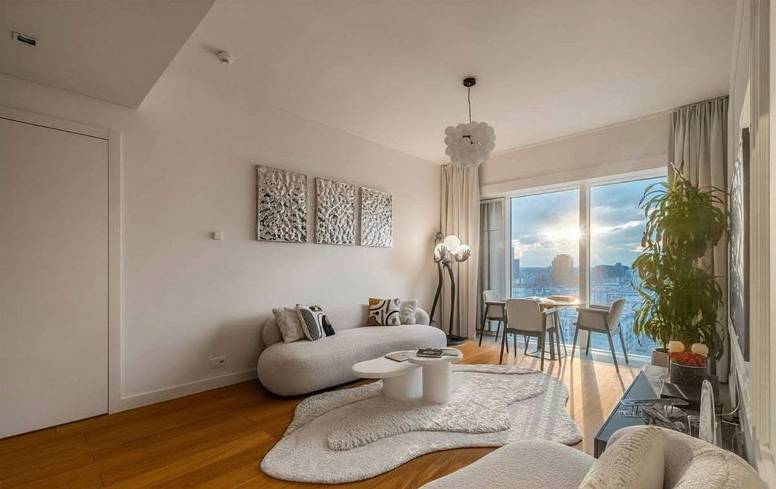 Jasny, przestronny salon z panoramicznymi oknami i zachwycającym widokiem na Warszawę